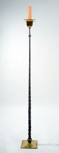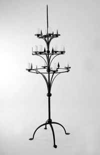 Der große Bodenleuchter, welcher ausnahmslos in traditioneller Schmiedetechnik gefertigt wurde, ist ca. 1,80 m hoch und etwa 40 Kg schwer. Über dem Hauptstab stützen sich 3 Ringe in unterschiedlicher Größe, welche insgesamt 12 Schalen für dicke Kerzen tragen. Der Hauptstab ist fast auf seiner gesamten Länge torsiert. Die 4 Füße sind konisch aus Vollmaterial heraus geschmiedet.