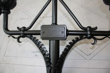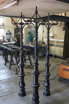 Die ca. 2m hohen Leuchten sind im unteren Teil aus Gusseisen und im oberen Teil aus schmiede Elementen gefertigt.